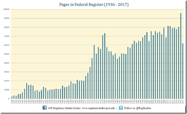 The following table shows the number of pages in the Federal Register from 1936 through 2017. The 61,950 pages (includes regulatory & deregulatory actions) published in 2017 was the lowest since 1993.